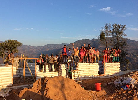 Deux ONG rivalisent sur l'idée de sacs de riz remplis de terre pour construire les murs. Une néo-zélandaise et une émanant d'une ONG népalaise. Les deux solutions ont, semble-t-il, résisté aux tremblement de terre. Ouf.La néo-zélandaise :http://www.firststepshimalaya.org/